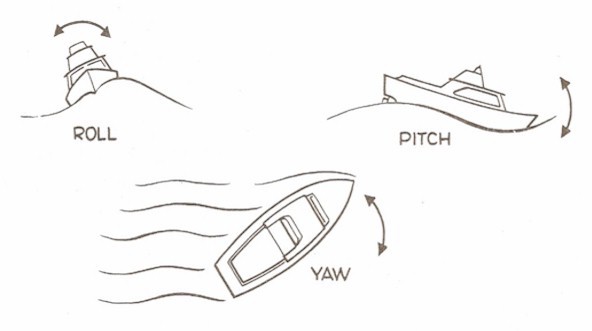 As you paddle your boat, you’re generally dealing with 4-degrees of freedom: 1 translational degree (forward motion) and 3 rotational degrees (pitch, roll, and yaw). In waves there will also be some vertical translation and some lateral translation, but we can ignore those directions for purposes of this discussion. We’ll also ignore forward motion for the most part and focus on the three degrees of rotation. Think of three axes running through you and your boat: a longitudinal axis runs end-to-end in the boat; the boat rolls around this axis from beam waves, rocking you side to side. Another could be thought of as running perpendicular to the longitudinal axis and basically going through your rear end out either side of the boat and parallel to the water. This is your pitch axis; the boat pitches up and down at the front and rear from going into or being passed through by waves. The third axis could be thought of as running straight down through your head and back and out the top and bottom of the boat. This is your yaw axis; angled waves, eddys, etc. will catch either the nose or tail of the boat and cause the front and back to yaw side to side. It really gets fun when water conditions cause your boat to pitch, roll, and yaw all at the same time! For the purposes of looking at this mathematically, we could consider the boat to act as a pendulum in each direction, with the pivot point being the intersection of the axes (basically where your bottom sits). For some good images of pitch, roll, and yaw in a boat, see http://www.boatsafe.com/nauticalknowhow/captpat1.htm