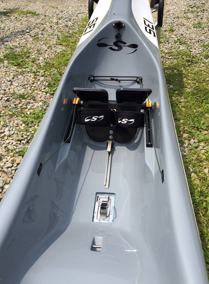 Now to be fair, Stellar isn’t the only one who has done this; Think introduced a similar River Layup last year. But I believe the Stellar Multi Sport layup has some significant advantages: 1. Stellar M.S. layups are set up to interchange between under-stern and kick-up over-stern rudders. A kick-up rudder takes a lot of the stress out of running a rugged river, but if you opt to take your boat out on the ocean or a large lake, the under-stern gives you the control in big waves that you need. The Think layups have only the under-stern rudder (as far as I can tell). 2. Andersen bailer used in the Stellar M.S. layup can be retracted when not needed, keeping your cockpit dry in colder weather, the bottom clean and drag-free, and one less item to whack on a rock or log. When it is needed, it’s a very effective bailer than can rapidly suck the cockpit dry. The Think boats have a fixed bailer that adds drag and can get knocked off. 3. Rounded bows on the Stellar boats run over leaves and weeds without catching them; plumb bows, such as used on Think boats, seem to catch and hold all manner of debris, slowing the boat. 4. Stellar’s 3-point footplate is simply the best in the business.