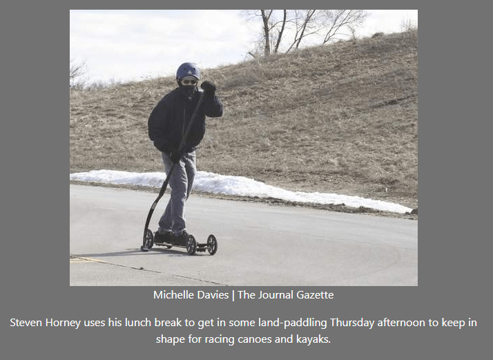 Out land paddling at lunch with a carbon BraapStik and ZenXTen’s new big-wheel board when a newspaper photographer happened to catch me in action. Wondering what the heck I was doing, she stopped me, asked what I called this activity, and promptly put my photo on the front page of our Fort Wayne paper! Land paddling not only helps keep you in solid paddling shape, it can make you famous!