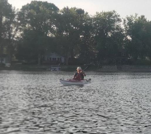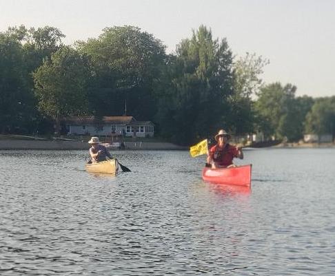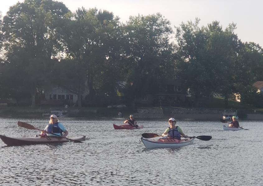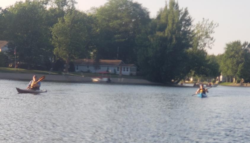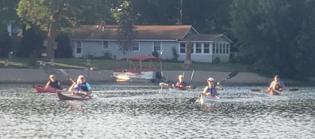 Golden Lake proved to be a “golden” paddle this evening. Although we missed a few regulars, we still had a considerable turnout. I suspect more than one person was just happy to see some other souls after spending too much time sequestered at home. Canoeists increased their representation to 4 on this paddle: Tadd, Steve Evertson, and Larry paddled “North American style” canoes, while I brought along my “Hawaiian-style” outrigger canoe. The rest of the gang stuck with the double blade.