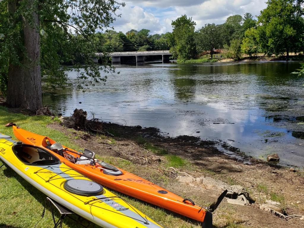 Ted and I weren’t closing the gap on Bill, but then Bill made a strategic mistake. North of the second bridge there’s a spot where the river widens significantly. I’m not the best at reading rivers, but I know the formula Q=Av, where Q= flow rate, A=cross sectional area, and v=velocity of the flow; i.e. the current velocity drops in half when the area doubles. Bill opted to stay close to shore. I chose to shoot straight across instead, significantly shortening the distance while the current was weaker. Ted decided to follow Bill’s route. The end result was I ended up right on Bill’s wake while Ted lost ground. And so I hung with Bill the rest of the way up and most of the way back down. I lost a little distance in the weed bed, but stayed close enough that Bill was blocking me at the downstream bridge turn. Heading back upstream for lap 2, I was a little behind Bill, but then I made a strategic blunder and crossed over to the right side of the river, hoping if I got close enough to shore it would keep me out of the wind and that being on that side would give me an advantage by keeping me out of the weed bed. Bill continued straight, and by the time I realized I was losing ground and crossed back to the left side I was further behind. And so we stayed roughly in that position the rest of the race, with Bill leading and not about to back off, followed by me vainly trying to reel him in, then Ted, and Guy Gilman running close behind Ted.