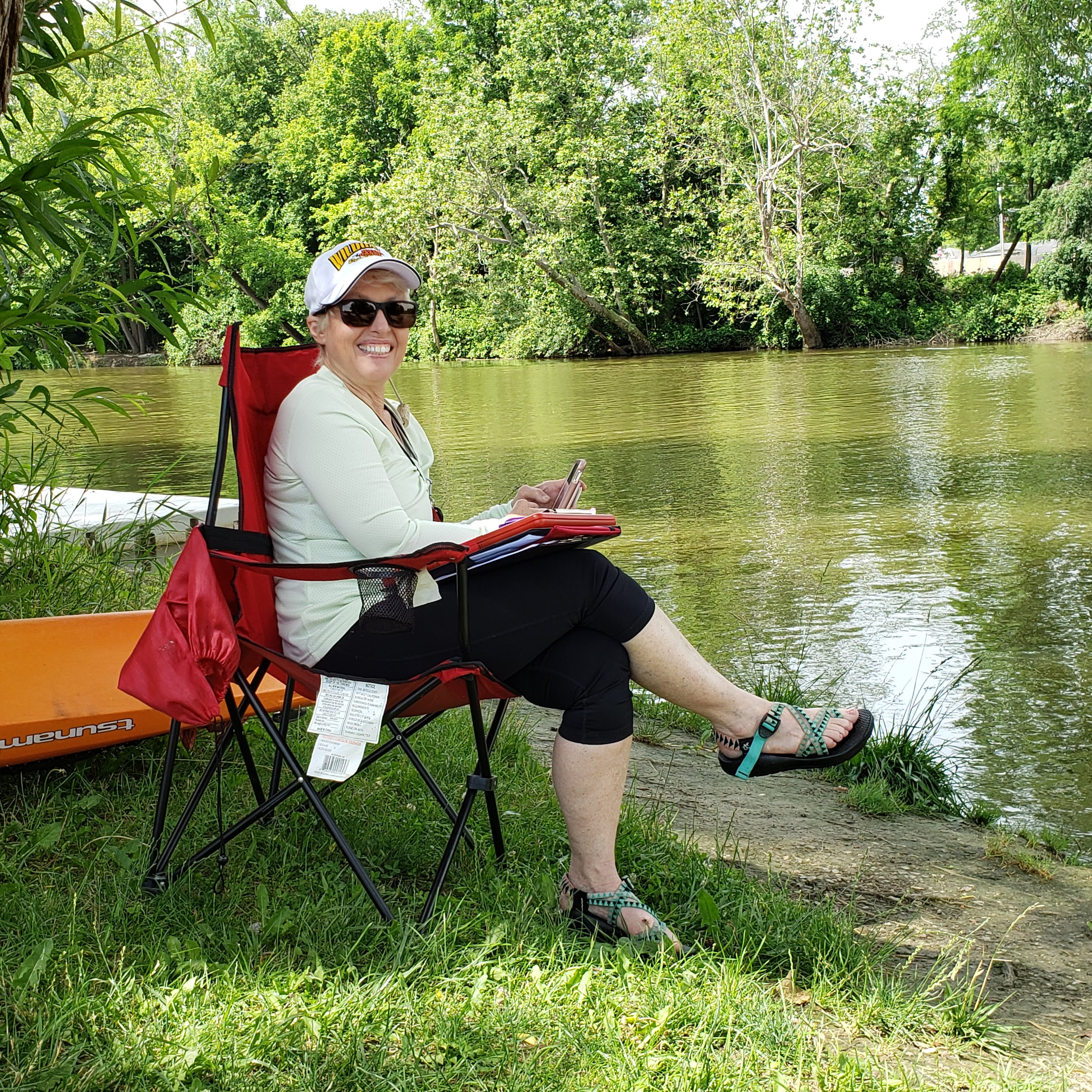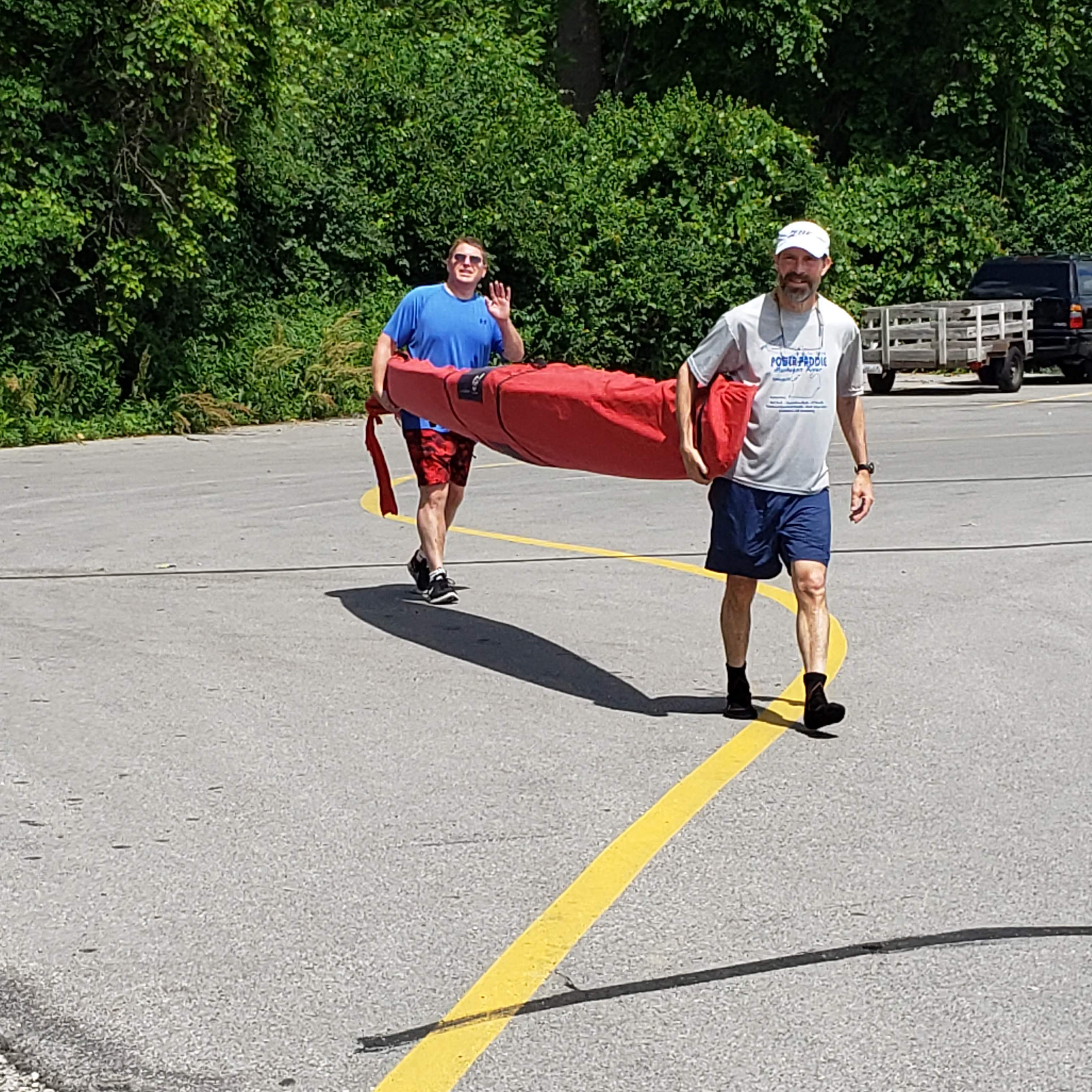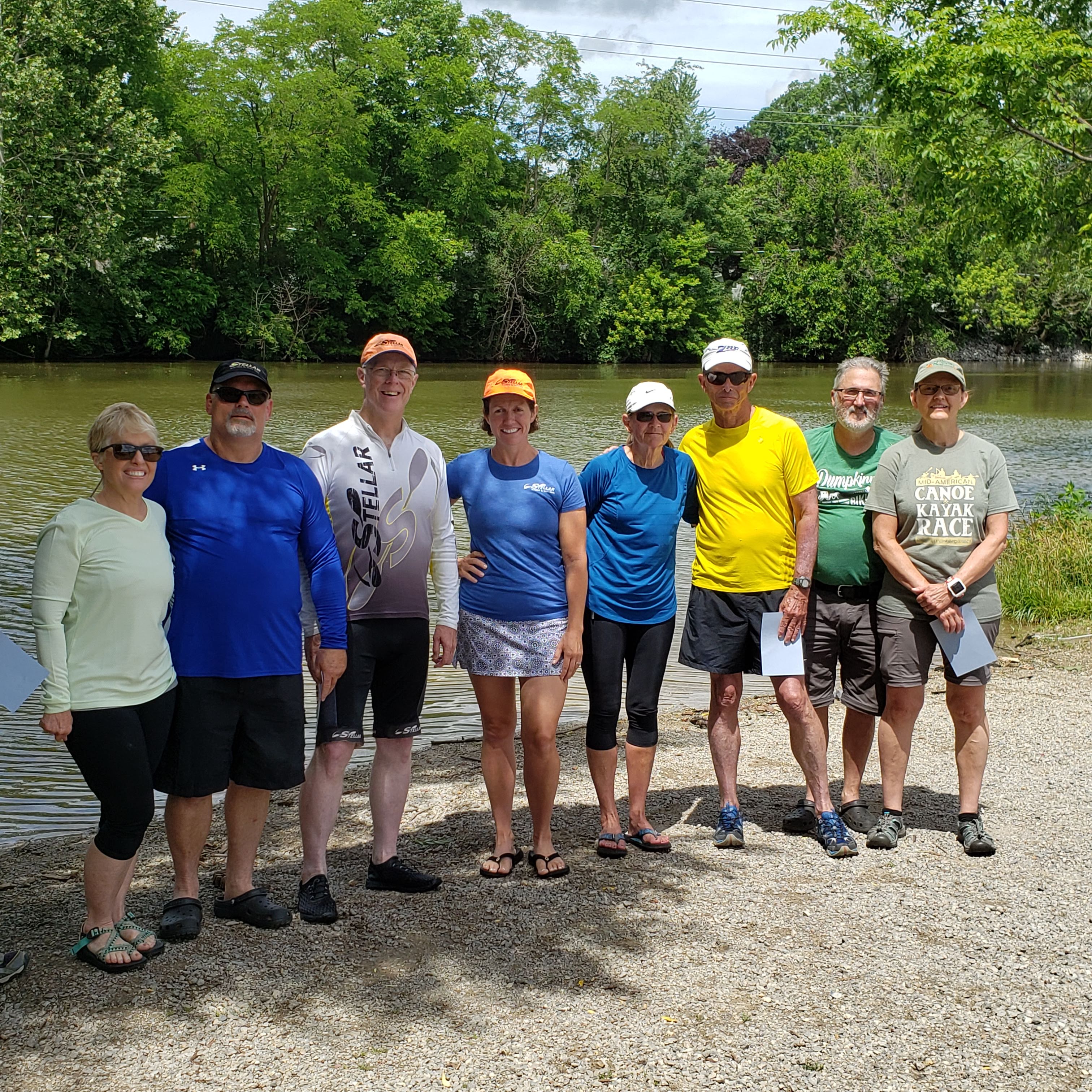 Race day was looking questionable as we prepared Saturday morning. Storms had run through the area, and some were wondering if the races might be cancelled. Silly paddlers; they should know by now that we might cancel a race for a tornado, but rarely for anything less. Lightning and rain just add “inspiration” to our paddling performance. As it turned out, the storms had run their course and cleared out nicely as registration began. It appears that Lori Schaffer had prayed for a particularly nice day, and the Almighty obliged. Temps were pretty comfortable, a nice change from the blistering temps that so often accompany this race, and the full foliage gave plenty of shade as well as beauty to the course.
