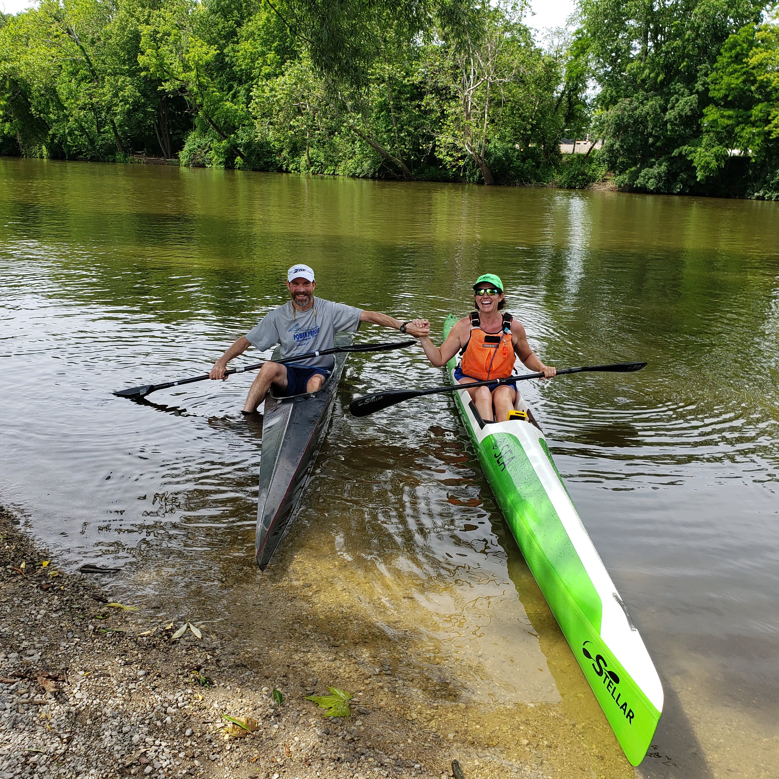 On the new side of the equation was Kymberly Byers, a first-time kayak racer. Kymberly ran the full course with enthusiasm, and put in a very good time even with a recreational boat and paddle. She’s quite enthusiastic about moving up in the sport with a better paddle and kayak, so watch out competitors! Not exactly new, but newer was John Christensen. John usually races with us a couple of times a year at our Fort Wayne races, but this year he had a new secret weapon: an Epic 18 Endurance carbon and a wing paddle. The 18 Endurance is an older design, but still a very fast sea kayak, as John proved Saturday when he just edged out Brent Ernsberger for the Sea Kayak class win.