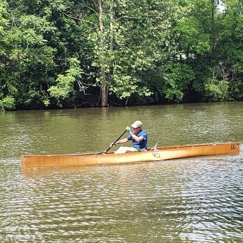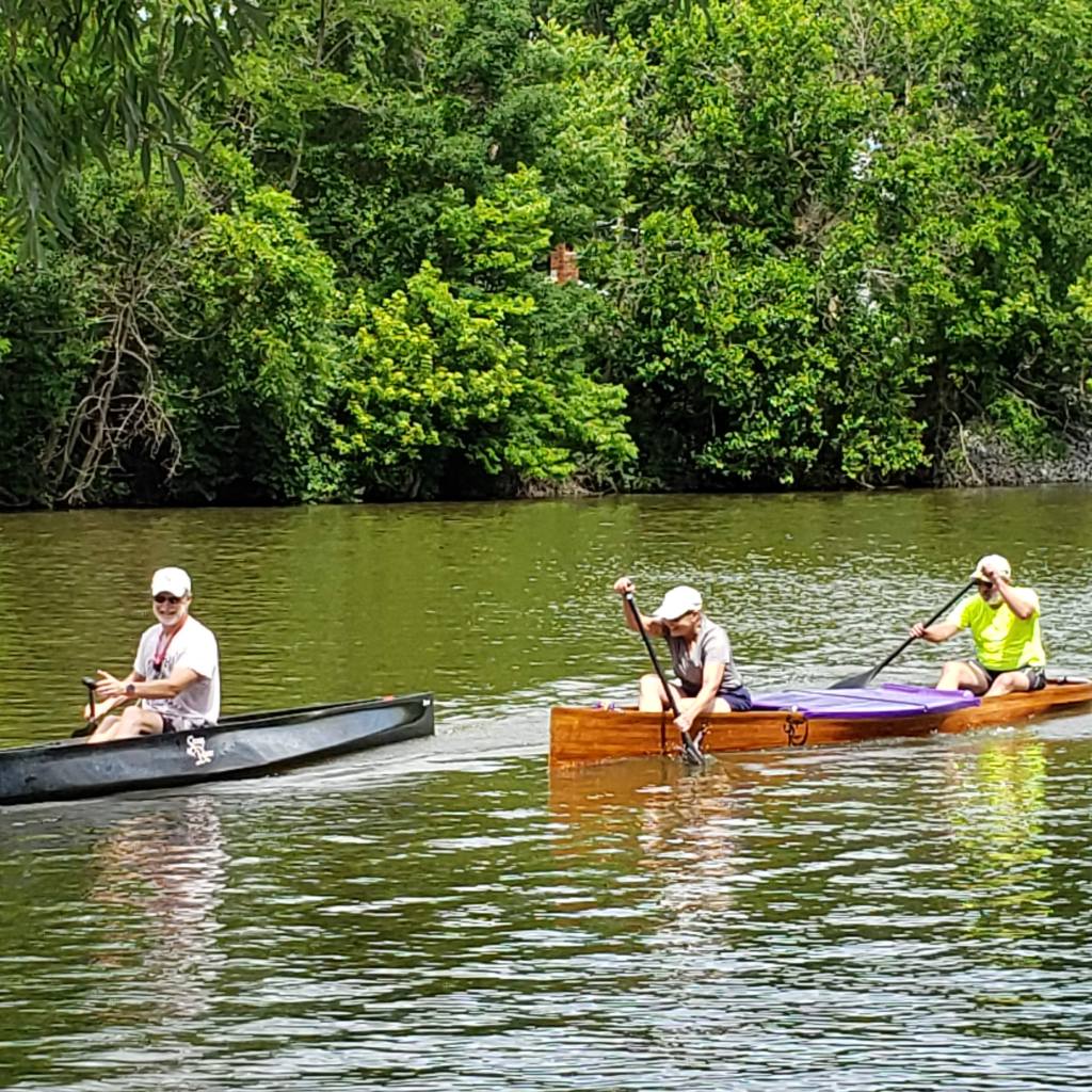 As for the running of the race, it shaped up this way: lining up for a down-stream start, we charged toward the St Joe Center bridge for our first turn. Several of us started out hard, gradually settling into our initial lineup to the bridge. Ted, paddling his classic down river boat ran neck and neck with Hollie in her surf ski, both of them pulling away from the rest of the group. I had charged ahead in my OC1 and hoped to keep Bill Kanost at bay at least until the bridge turn (about .9 mile from the start), but ‘twas not to be; ol’ Bill pulled past me on the way down and refused to relinquish the lead for the rest of the race. Brent Ernsberger and John Christensen passed me before the bridge as well. Coming out of the bridge turn I followed Bill going up the middle of the river, but then I noticed Jim Anderson starting to edge past me on the left side. Knowing that no one knows this river like Jim, I moved over and latched on his wake, riding it most of the way to the Mayhew Bridge, our turn point at the opposite end of the course. This proved to be a wise move; hanging behind Jim we gradually reeled in Brent and John in pursuit of Bill. Jim did take me through some branches and log gaps on the river, but I managed to hang with him through most of it until near the bridge turn.