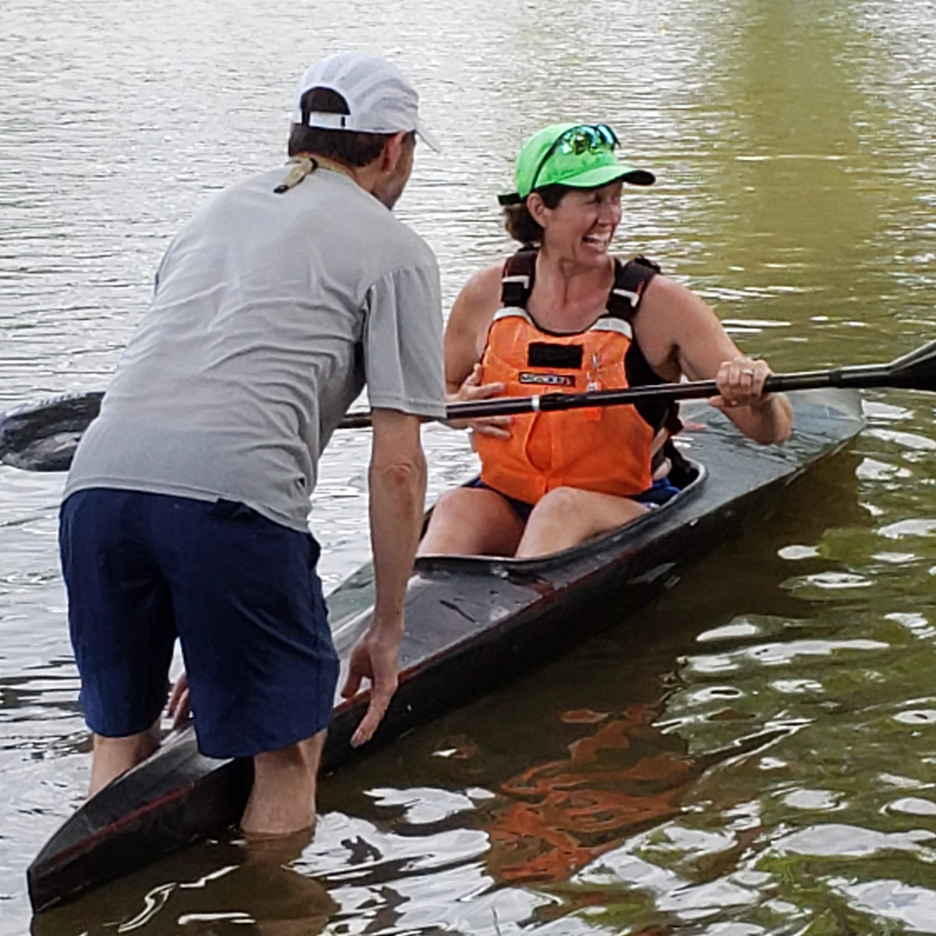 Well before Brent and John came in, Ted and Hollie were duking it out, running a tight race nearly all the way. Ted managed to take the overall win by 16 seconds, but what a competition that was! While awaiting the return of the rest of the gang, Ted and Hollie swapped boats and tried out some different rides. I had passed Jim and was nearing the finish when I saw Ted paddling upstream in Hollie’s SEA; Ted in a surf ski must be a sign of the apocalypse!