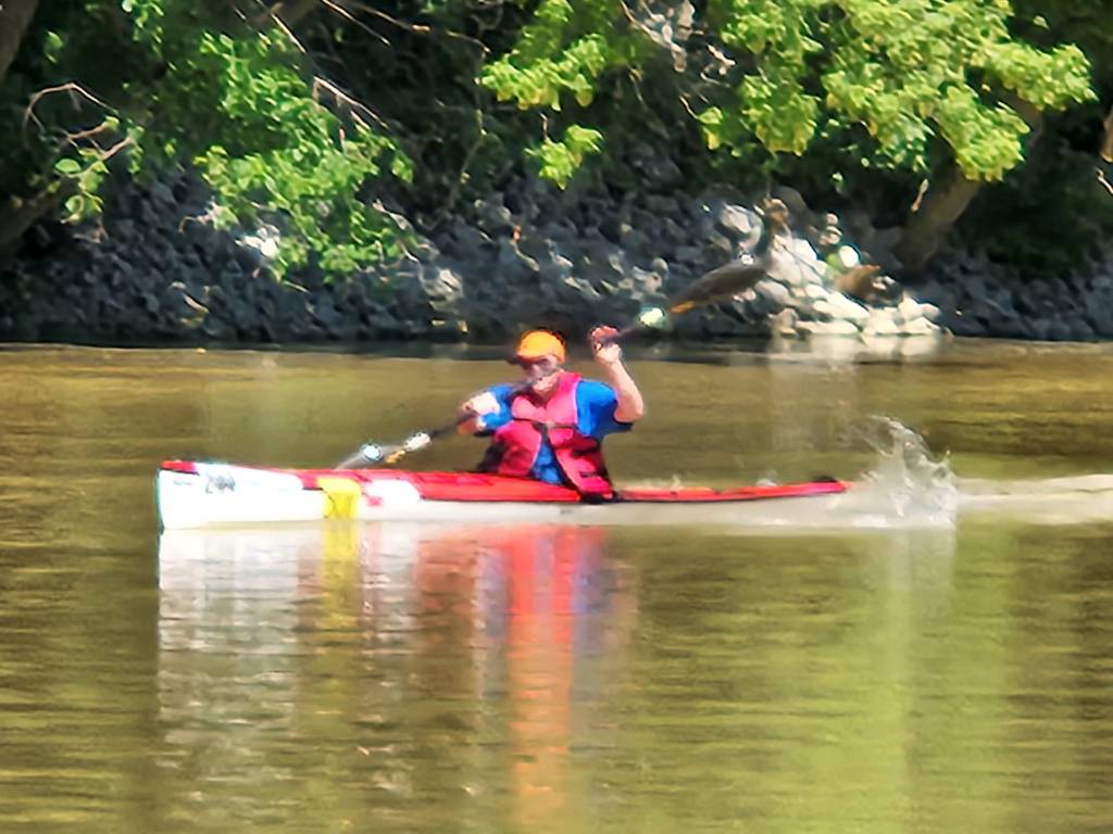 As usual, we started from Shoaff Park and headed downstream .9 miles to the St. Joe Center Bridge, rounded a pylon and headed north to the Mayhew Road Bridge, rounded a pylon there, and headed back. I’ve GPS’d this course at 9.7 miles in the past. At the start, we charged out hard. Bill Kanost got tossed about in the wake a bit, while Oleg kept far left to stay in clearer water. I ran pretty much even with Oleg and Paul Kane at the beginning, but it wasn’t long before things got stirred up a bit. Ted Beatty came charging up fast in his downriver boat, while Larry Swift really pushed his surf ski along. Coming to the St. Joe Center Bridge, Ted was leading, with Paul and Larry running close and Oleg off to the side running in the lead as well. I was back several boat lengths at this point, but the Falcon can practically turn in its own length (quite a change from the SEL I usually race), while Oleg had to use two pylons to get his ICF boat turned. Coming out of the turn, I was once again even with Oleg, but that didn’t last long as Oleg pulled away. And shortly thereafter Bill Kanost came paddling up rapidly. Oleg had dominated this gang in the past, but this week Ted and Bill were in fine form – and especially Ted, who set a blazing time and came in first overall, with Bill about 3 minutes behind him and Oleg about a minute behind Bill.