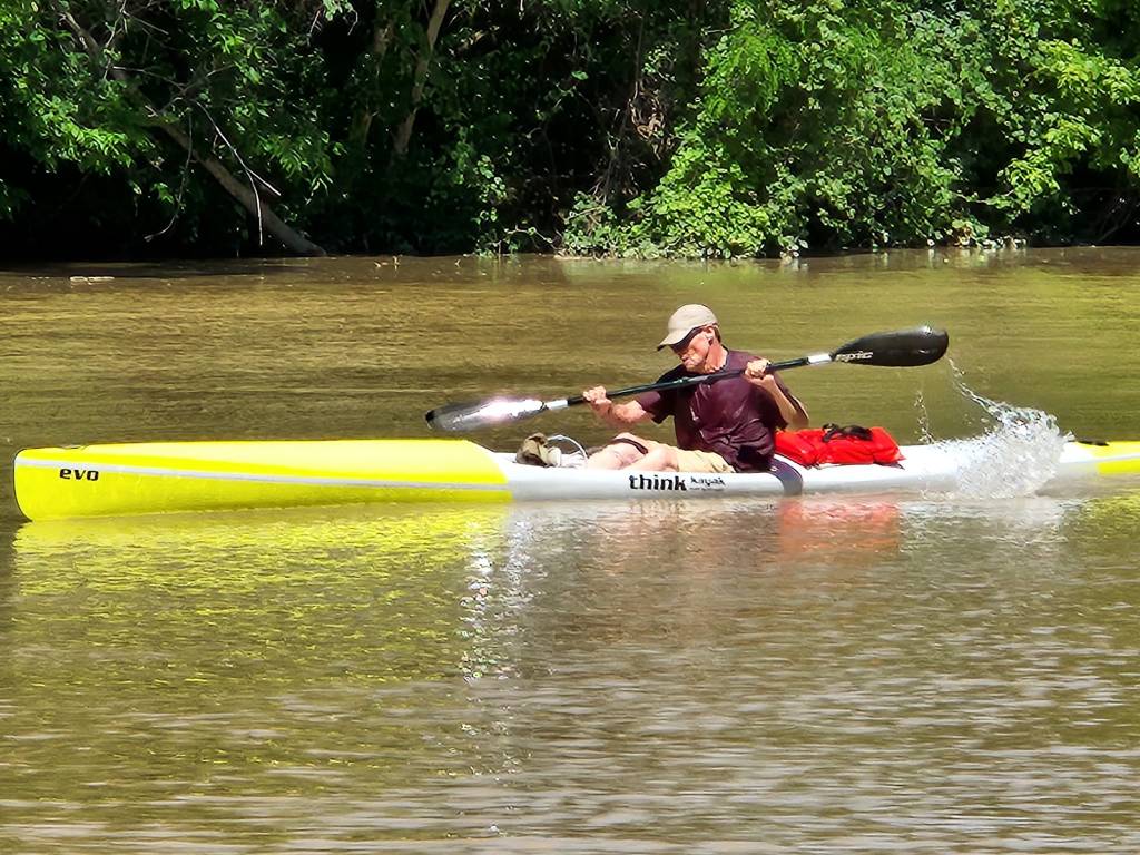 Race conditions don’t come much better than those we had this past Saturday for Lori’s Fort Wayne Canoe & Kayak Races. Temps in the 70’s, plenty of water, and only a light current made for an excellent race venue. No one even hit a log! This race has frequently been a kayak-centric race, and never more so than this past race, as all competitors were in kayaks with the exception of Dwight Walker and his daughter Lacy Buck, who paddled a C2 Cruiser and George Tinsley / Hilman Culp in their aluminum C2. Out of 15 competitors, 6(!) were in K1 Open and 5 in K1 Sea Kayak (4 men, 1 woman). I brought out my Falcon to this race; it sure looked cool, and it ran great! It was just that the motor was rather decrepit…